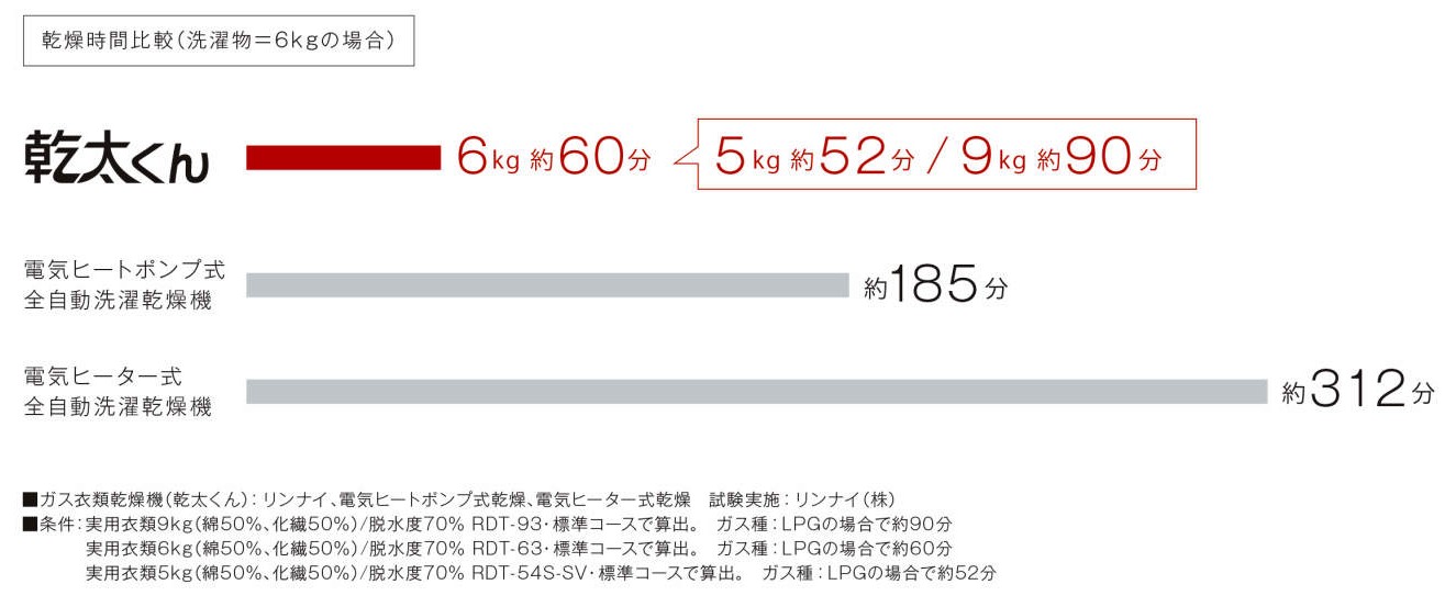 ガス衣類乾燥機の乾太くんなら、6kgの洗濯物を約60分、9kgの洗濯物を約90分で乾燥。