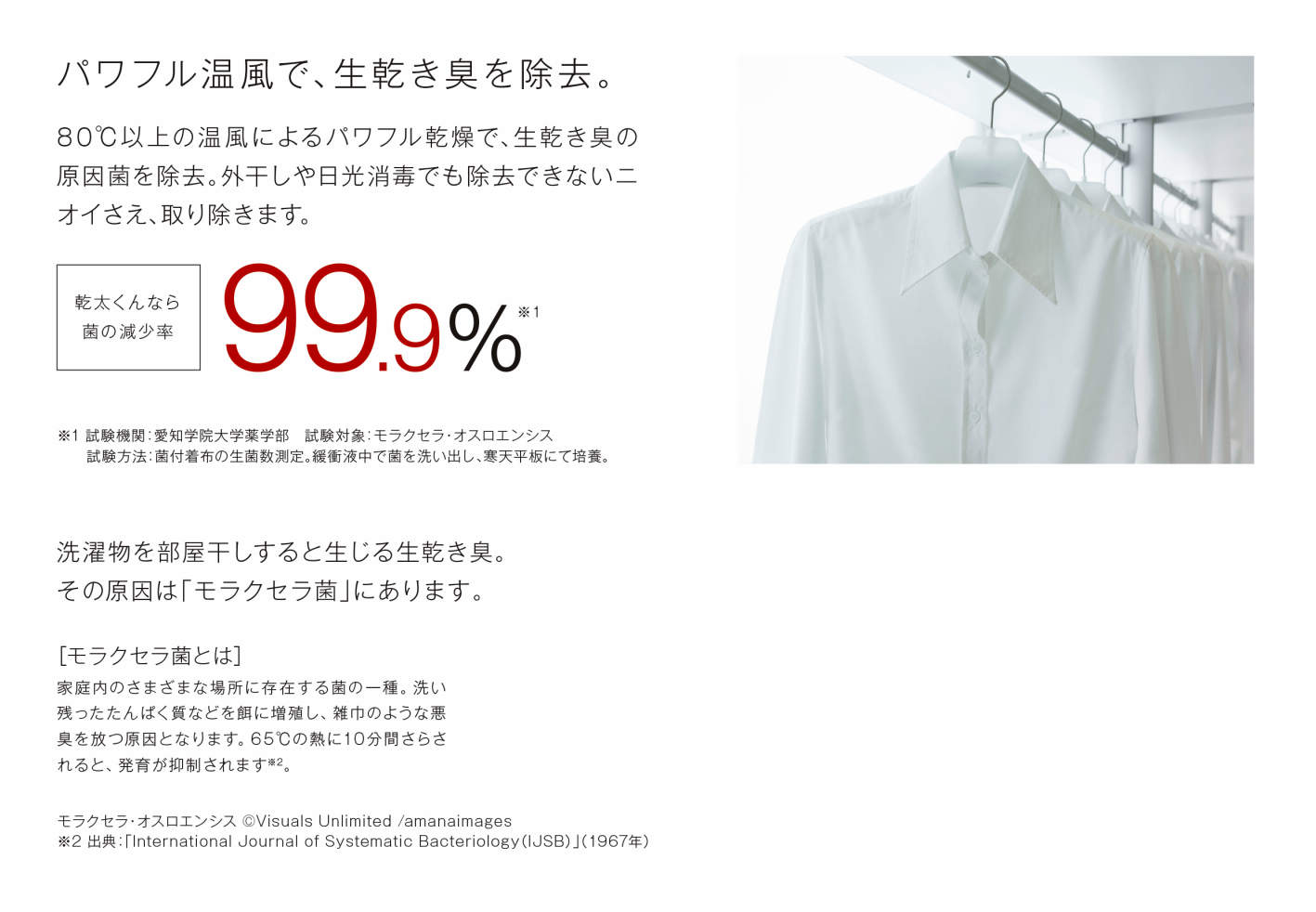 80℃以上の温風によるパワフル乾燥で、生乾き臭の原因菌を除去。外干しや日光消毒でも除去できないニオイさえ、取り除きます。