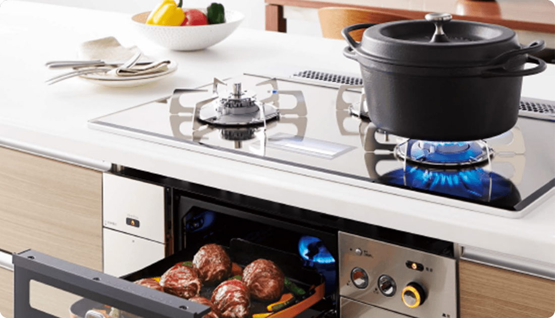 ビルトインコンロ 高性能設備機器家事楽商品 画像リンナイ DELICIA(デリシア) 画像ノーリツ PROGRE Plus プログレ プラス 各種メーカーのビルトインコンロを取り扱っています。 家事を楽にする自動調理。料理はもっとおいしくなる。